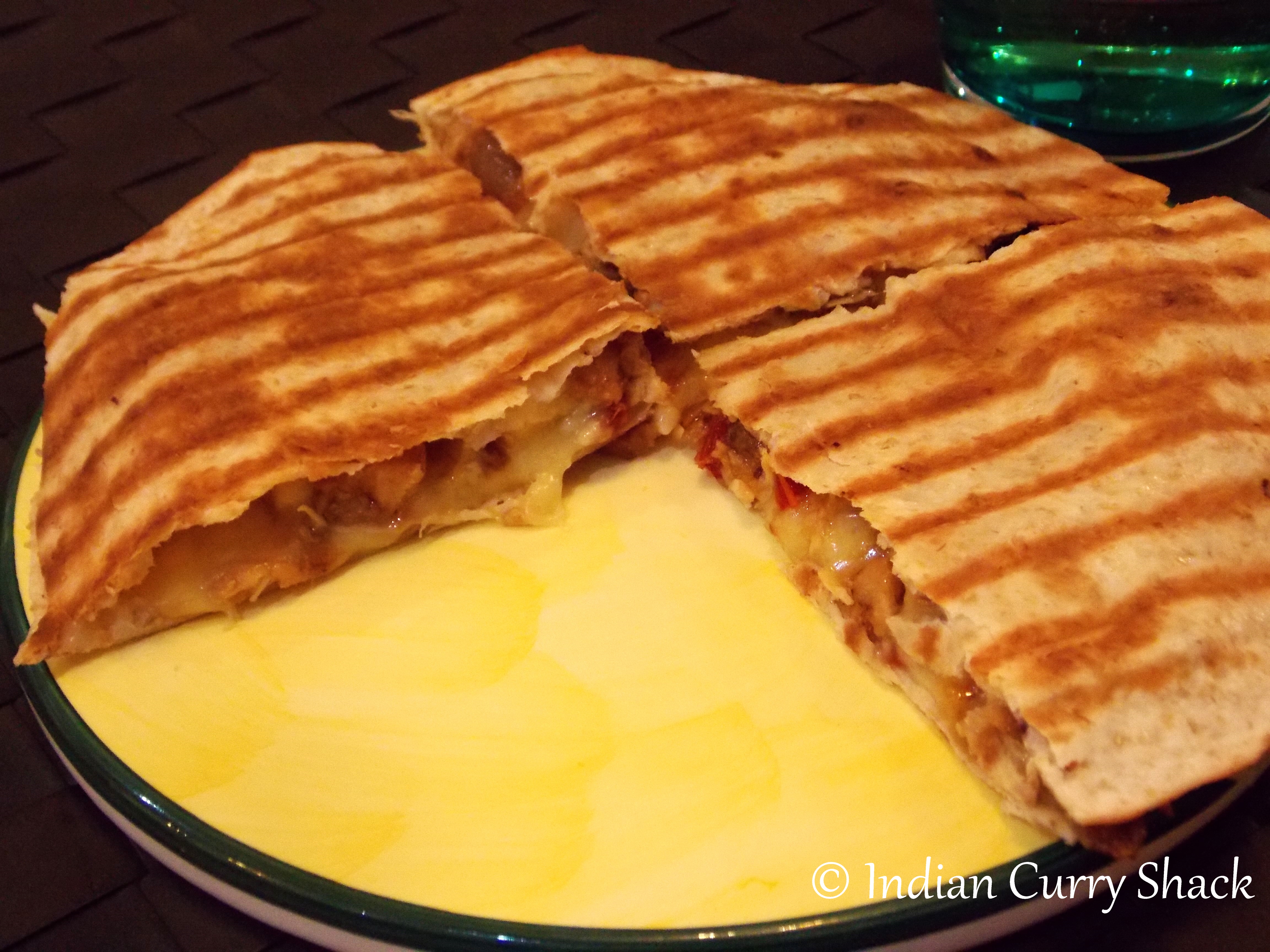 Quesadillas from the versatile Mexican Tortillas (thin flat breads made from wheat flour). Chicken and bell peppers are a succulent delight when cooked with melted cheese. This is a great recipe for parties.
