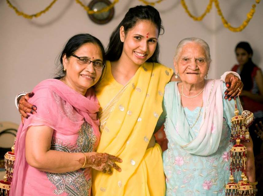 I remember how my sisters and I used to get excited during Kanjak (the ritual performed on Ashtami or Navmi mostly in North India) as we were worshipped on this day, fed with delicacies and were given gifts or money. Ghugni, Sooji Ka Halwa and Poori are the very popular and must dishes for this ritual. These are such delightful dishes that the whole family enjoys having these on this day. Mum has been an expert in making these delicacies and I learnt making these from her. Talking about Sooji Ka Halwa, I can’t miss my maternal grand mother. She truly has magic in her hands and when she is making it, you won’t believe we kids (yeah, I know we’re no more kids 😦 but feels nice that we are still kids for her 😉 ) wait with spoons in our hands so that the moment Sooji Ka Halwa is prepared we are ready to attack on it… Haha. Talking about mum and grand mum, here’s a photo of all of us together – this was clicked on my wedding morning during a pre-nuptial ceremony.