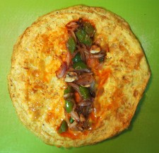 For the egg rolls – Beat 4 eggs with some red chilli powder, ground black peppercorn and salt to taste and keep aside. Head a non-stick pan/griddle with a teaspoon or two of cooking oil. Pu 1/4th of the egg mix and spread across the pan, now quickly put one tortilla on top of the egg mix in the pan. Press the tortilla from all sides to ensure it sticks well to the omelette. Now just like omelette, flip the egg along with tortilla and cook from the other side.