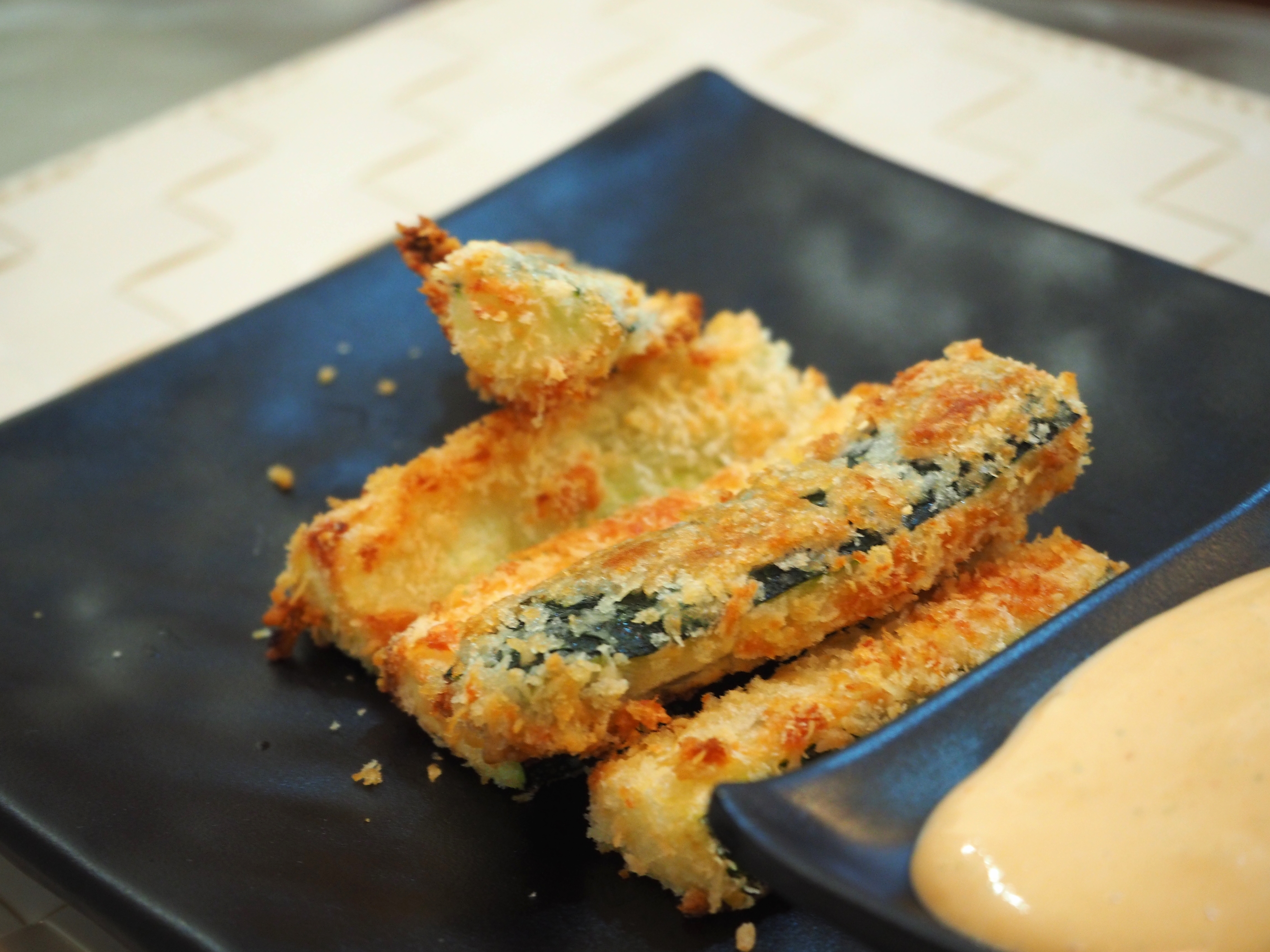 Dredge the zucchini sticks in the flour mixture and then dip them into the egg whites. Finally, dredge them in the breadcrumbs. Place the coated zucchini on the prepared baking sheet and roast, turning once, until crispy (about 12 minutes).