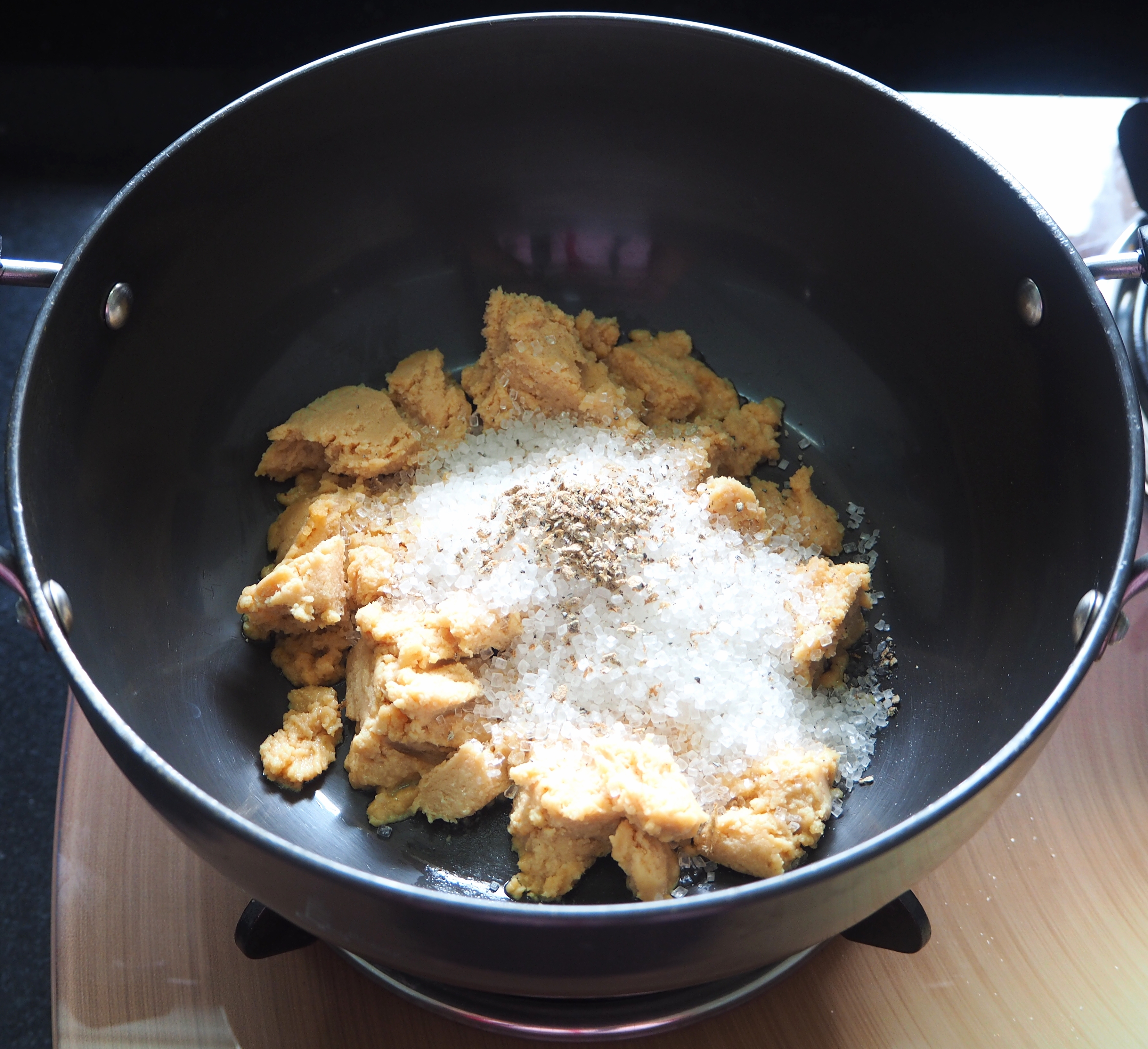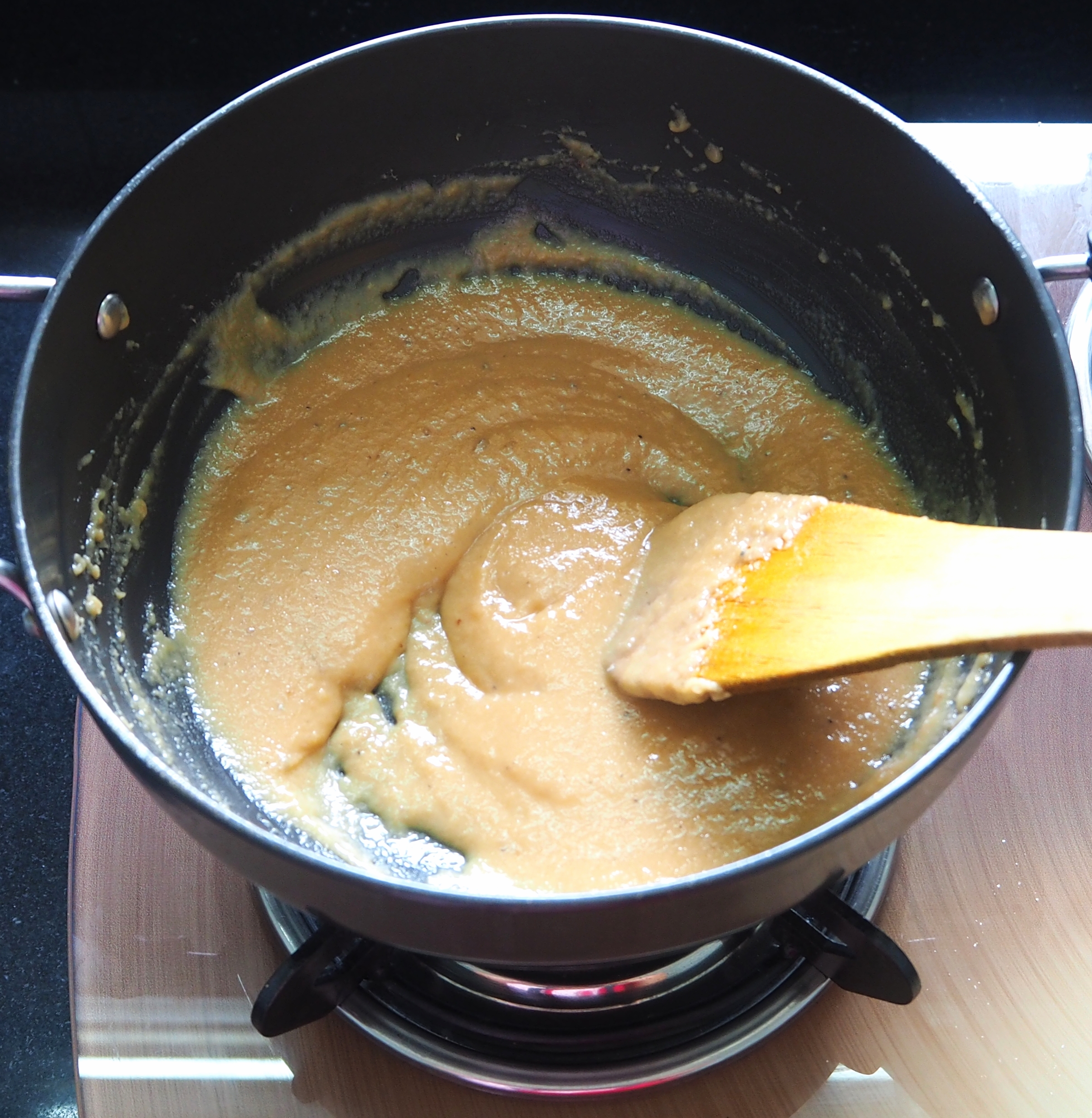 In a pan, heat mawa/khoya (dried whole milk/thickened milk) with sugar and crushed green cardamom seeds. Keep stirring for about 15 mins on low to medium heat (the mixture will start bubbling). Keep the mixture aside to cool for 7-8 hours or overnight.
