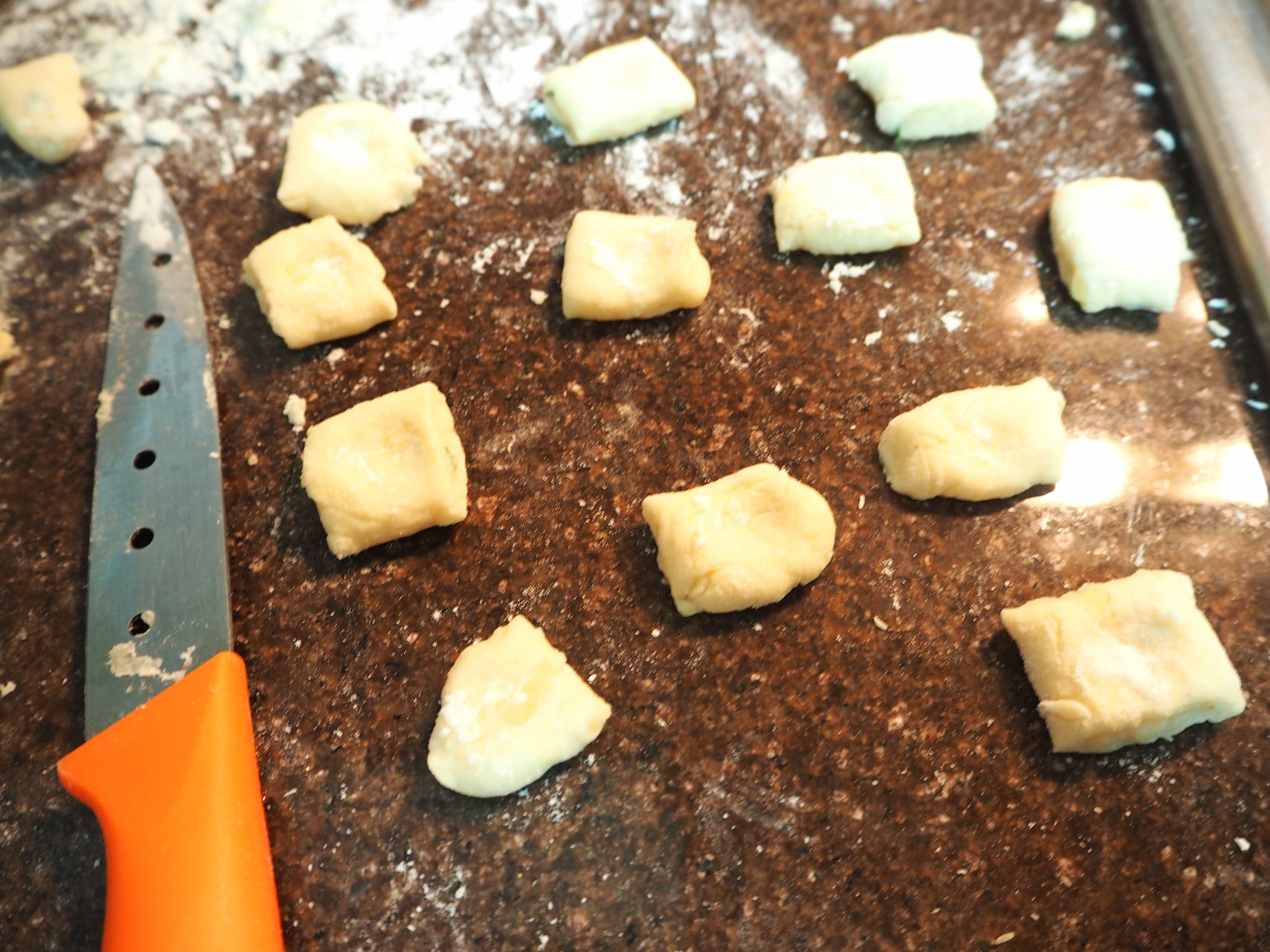 Cut the dough in half and shape each piece into a long cigar shape about 1.5cm thick. Using the back of a floured table knife, cut each length of dough into 2cm pieces to make ‘pillows’ or individual gnocchi. Gently press each one in the centre using your floured finger. (The dent will hold more sauce and allow the gnocchi to take on more flavour.)
