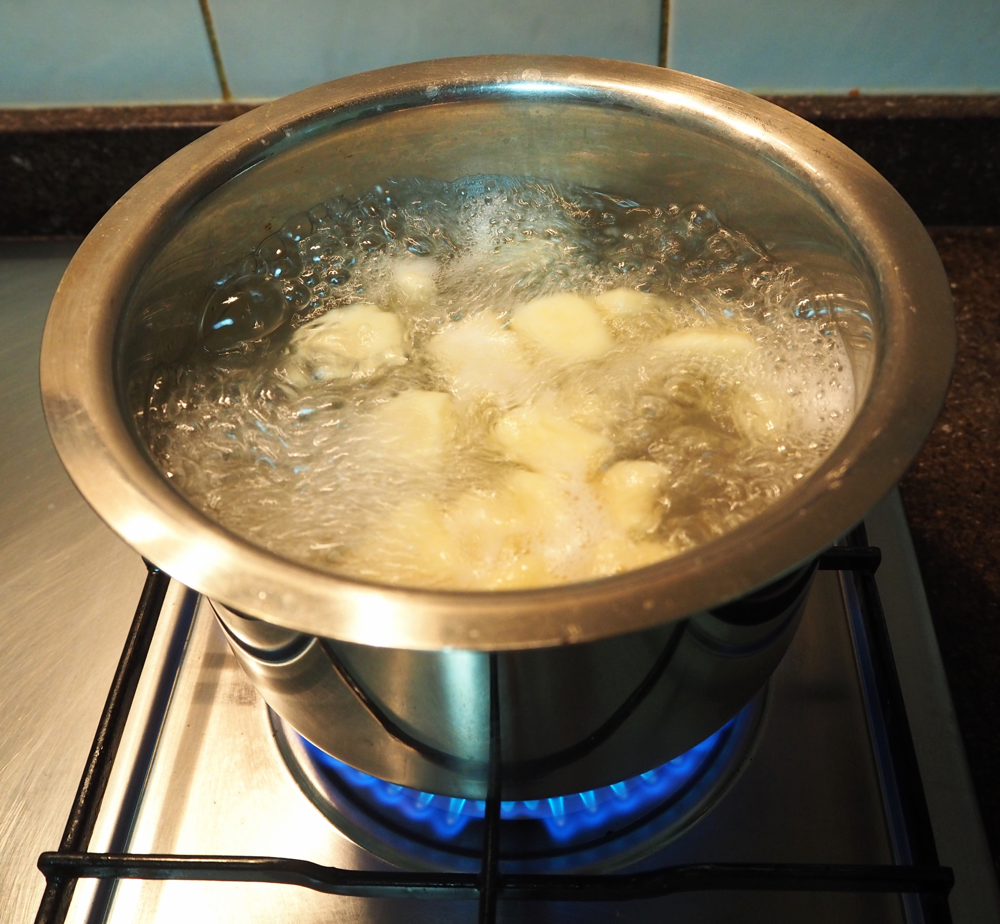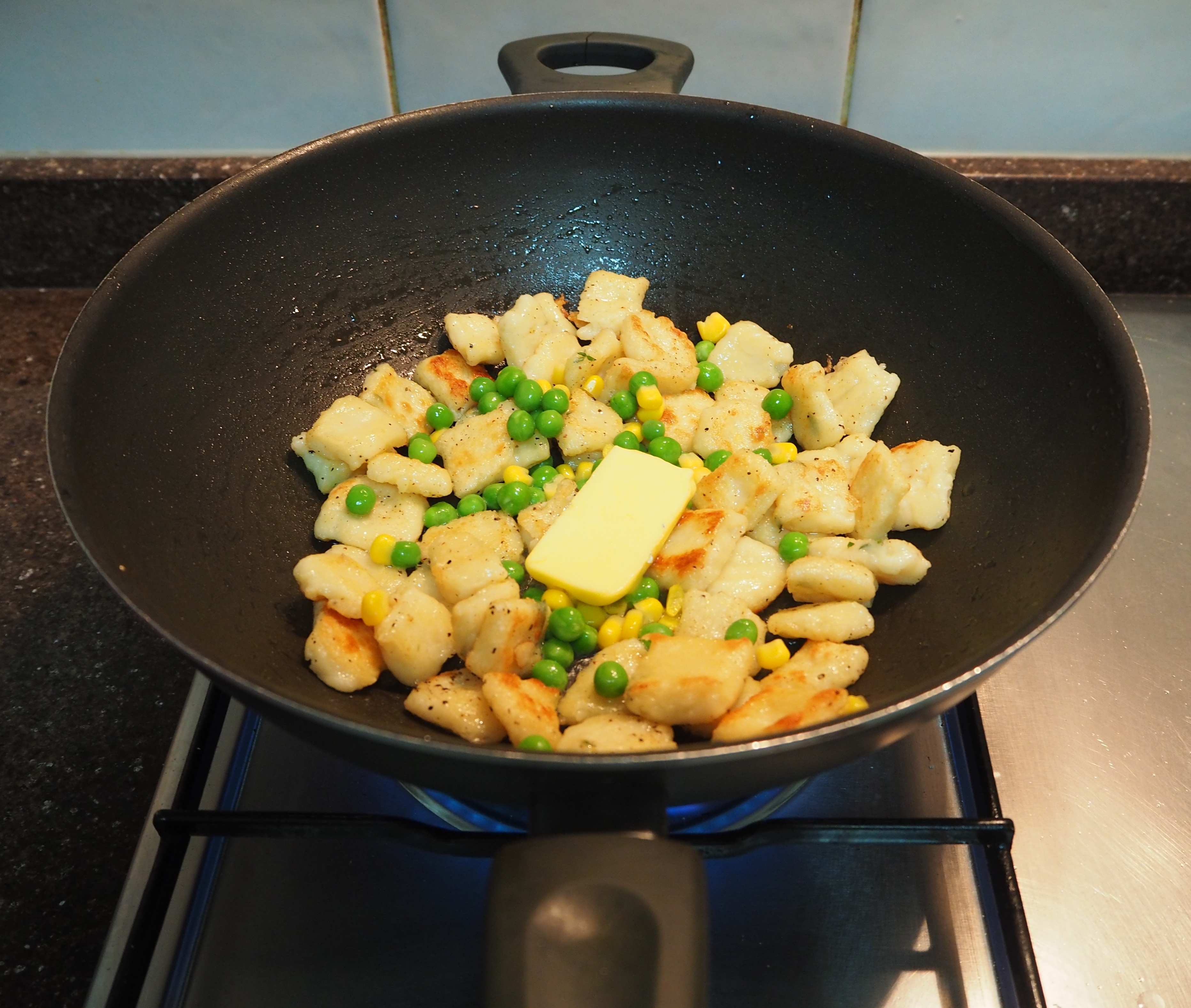 Bring a large pan of water to the boil. Add the gnocchi, tilting the pan from side to side briefly to stop them sticking together, then simmer for about 1½–2 minutes until they start to float. Drain the gnocchi and leave them to steam-dry for 1–2 minutes.