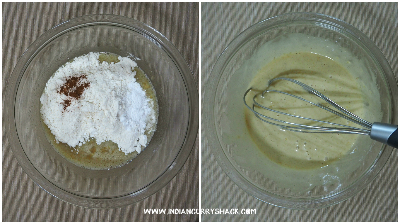 Add the flour, baking powder, baking soda, cinnamon powder and salt and whisk until all combined.Banana Muffin - Steps 3 and 4 - Collage - Indian Curry Shack